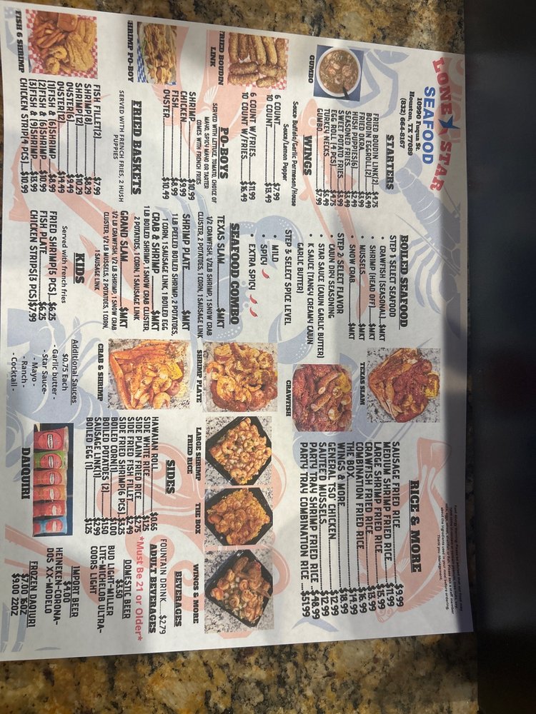 Located in Houston, Texas, Lone Star Seafood brings the rich flavors of Cajun and Creole cuisine to life. This seafood haven offers a menu bursting with Southern charm and bold spices, perfect for food enthusiasts. Begin your culinary journey with their Fried Boudin Link or crispy Hush Puppies, both of which tantalize the taste buds.